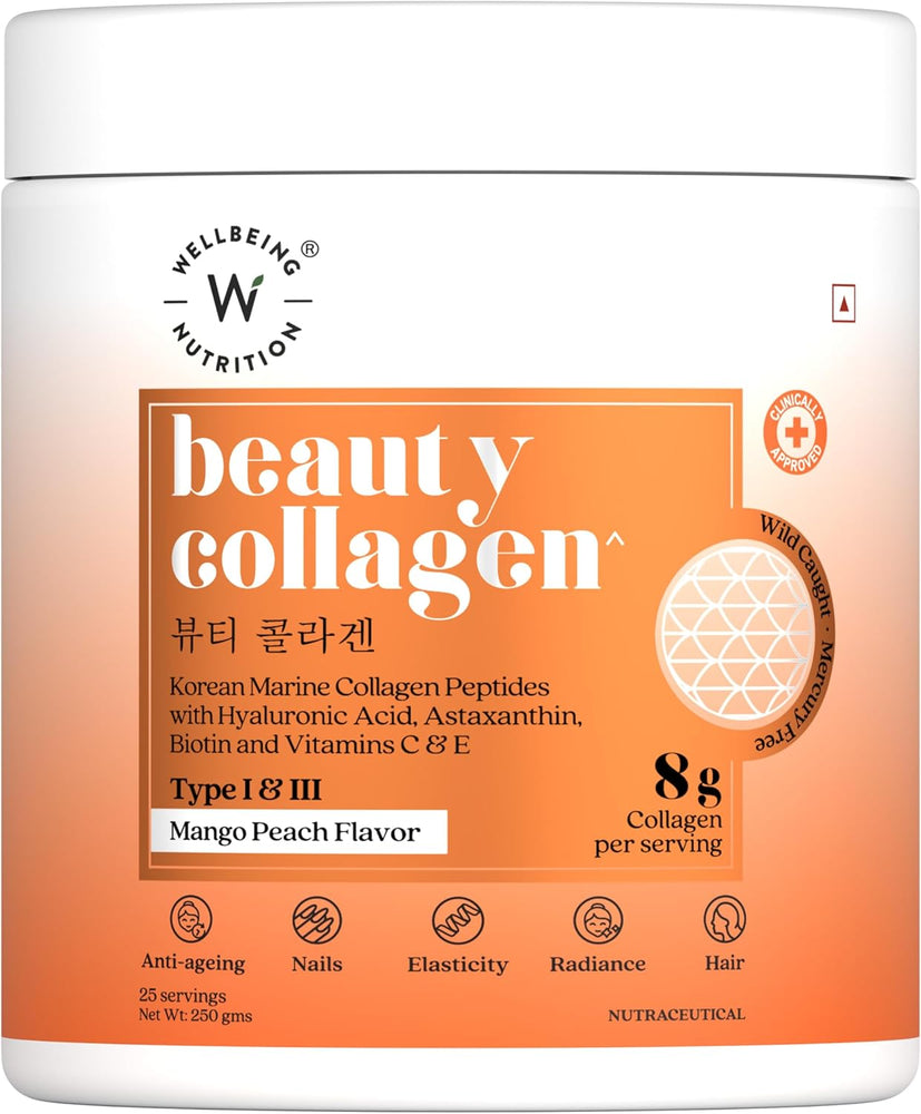 دللي بشرتكِ وشعركِ وأظافركِ بالتغذية التي تستحقها مع ببتيدات الكولاجين البحري الكوري من Wellbeing Nutrition Beauty . تركيبة مستخلصة من الكولاجين البحري الكوري عالي الجودة من أعماق البحار، مصممة لدعم مرونة البشرة، وتقليل علامات الشيخوخة، وتعزيز جمالكِ الداخلي.