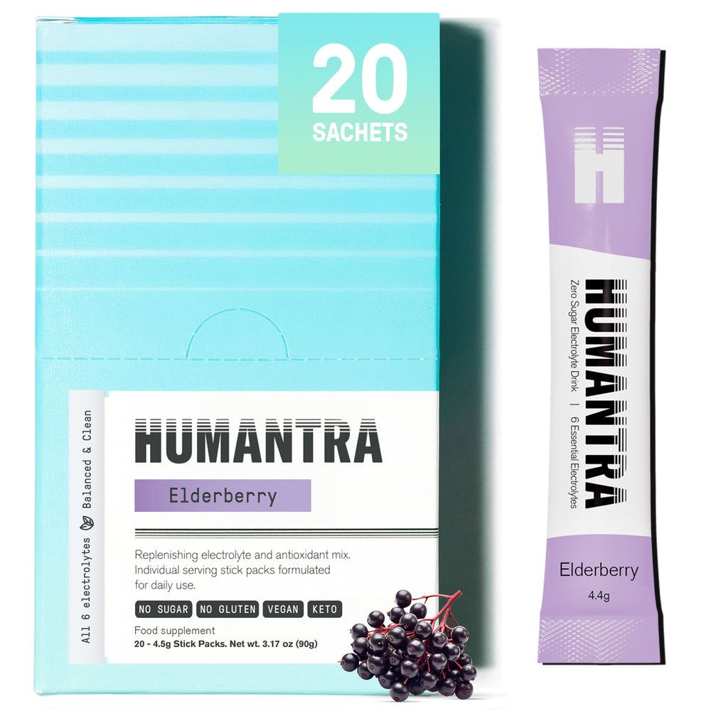 Humantra Electrolyte Elderberry هو مزيج مشروب إلكتروليت نباتي يجمع بين البلسان مع الإلكتروليتات الأساسية للحصول على ترطيب مثالي ودعم مناعي.