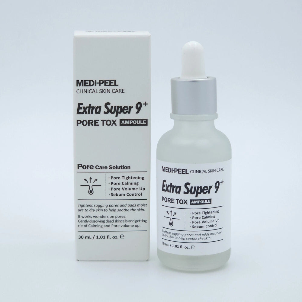 MEDI-PEEL Extra Super 9 Plus Pore Tox Ampoule is an intensive pore-care serum designed to purify, tighten, and refine enlarged pores. Formulated with a powerful blend of exfoliators, botanical extracts, and pore-tightening complexes, it helps control excess oil, smooth skin texture, and promote a clearer, more balanced complexion.