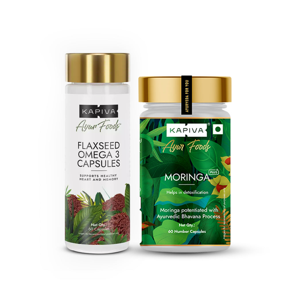 Give your body the support it needs with the Kapiva Flaxseed Omega 3 and Moringa Capsules combo. A one-stop solution for heart, brain, skin, joints, energy, immunity and overall wellness.